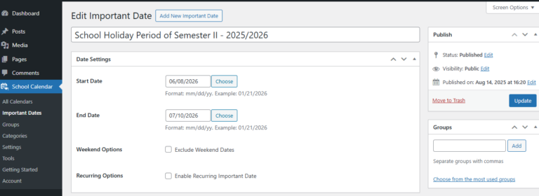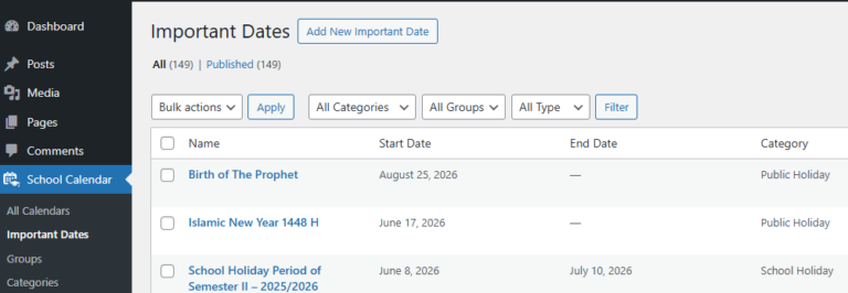 It’s very easy. First, click the School Calendar > Important Dates menu to display the list of important dates you’ve created. The screen below will appear.
