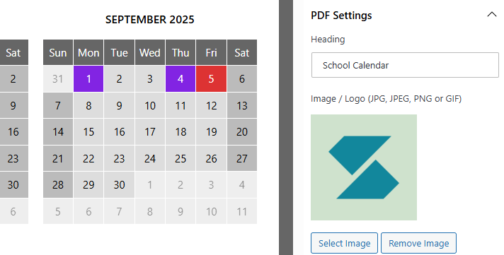 The school calendar editor has a feature to add image or logo to PDF calendar. This feature is located in the PDF Settings section, as shown below.